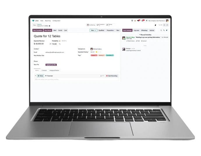 Basta con escanear una tarjeta de visita y Odoo crea automáticamente un nuevo cliente potencial con todos los datos relevantes.