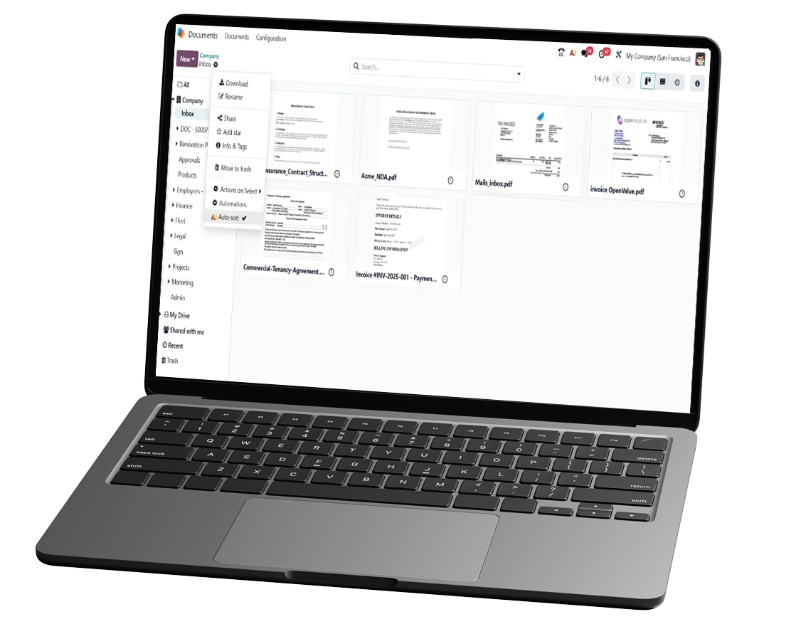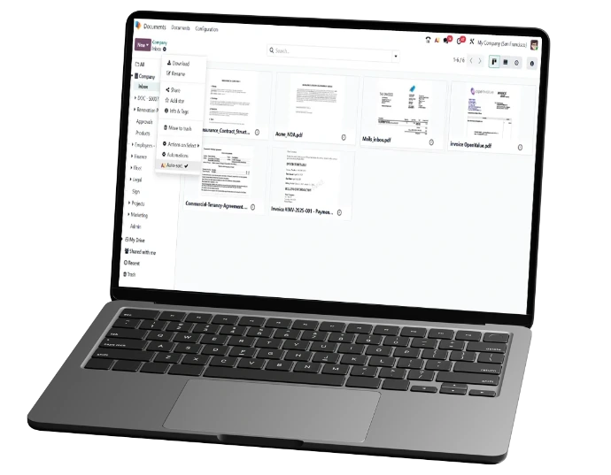Inserte archivos desde Documentos en cualquier lugar de Odoo utilizando el comando slash; los informes de contabilidad/auditoría pueden extraer anexos directamente desde Documentos.